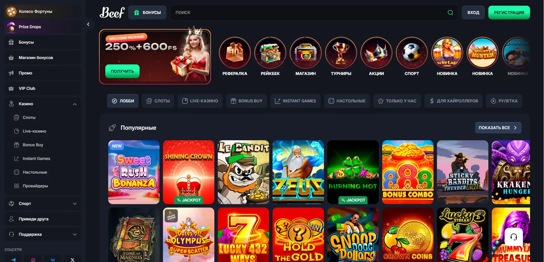 Beef Casino — это новое казино в Казахстане, запущенное в 2025 году компанией GALAKTIKA N.V. и работающий по лицензии Кюрасао. Платформа предлагает впечатляющий выбор из более чем 12 000 игр, включая свыше 800 столов с живыми дилерами от 96 ведущих провайдеров. Интерфейс доступен на русском, английском и немецком языках, а счет можно открыть в RUB, KZT, UAH, USD и EUR.
